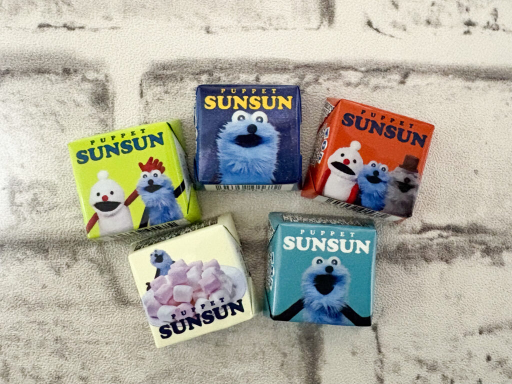 「チロルチョコ<パペットスンスン>」のフレーバーは、爽やかな「ブルーベリーマシュマロ味」です。